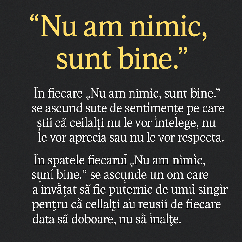 „Nu am nimic, sunt bine.” În fiecare „Nu am nimic, sunt bine.” se ascund sute de sentimente. Gânduri amestecate, noduri în gât, lacrimi neplânse. Se ascund răspunsuri pe care ai vrea să le dai, dar știi că nu are rost. N-ar fi înțelese. N-ar fi luate în serios. Sau ar fi privite ca „drame” de oameni care nu știu cum e să le porți pe toate în tăcere. Am fost […]